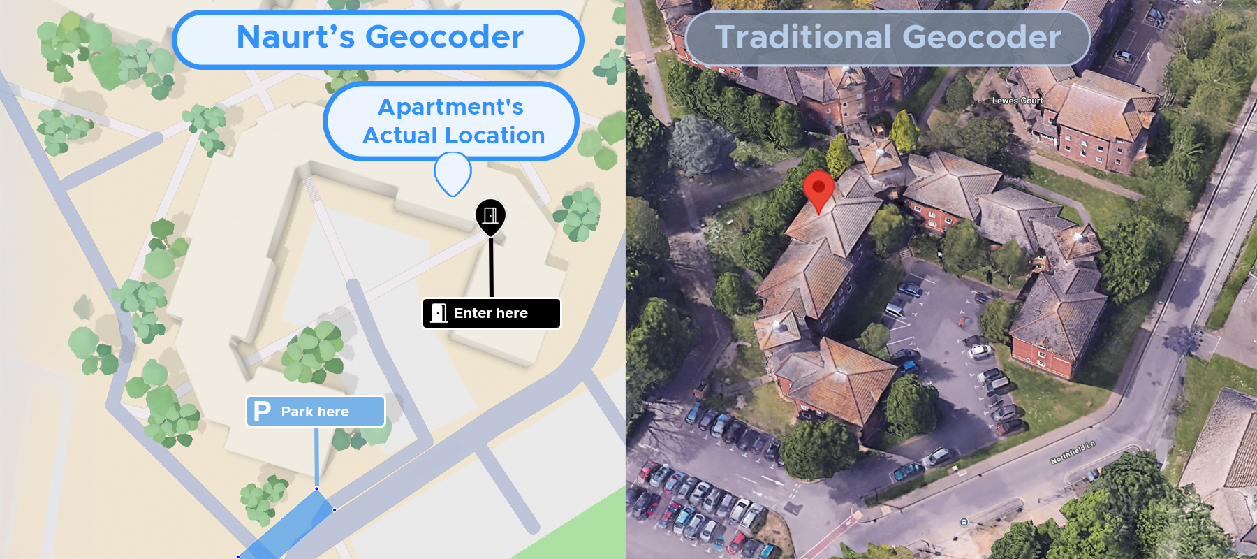 Instead of stopping at a rooftop or centre-of-building pin, Naurt adds the data couriers actually need, including: